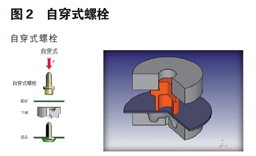 自穿式螺栓或螺母又稱自沖鉚螺栓或螺母,其中自穿式標準件是通過端部翻邊結構穿透板材并與之形成可靠互鎖結構的冷成型工藝。其 結構形式如圖 1、圖 2 所示。