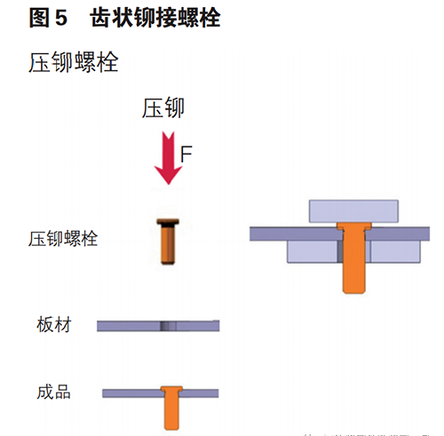 鉚接又稱壓鉚,又叫自扣緊,是一種與板材通過法向結構或者徑向結構互鎖的標準件連接形式。主要有齒狀互鎖壓鉚和折邊互鎖壓鉚兩種。可廣泛應用于鋁合金車身的沖壓件,擠出件和鑄造件各類零部件上。以下內容分別介 紹上述兩種常見類型的鉚接標準件。