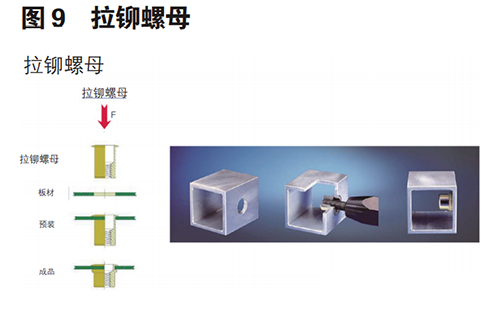 拉鉚是通過標準件頭部拉壓變形膨脹,與端部法蘭面上下夾住板材開孔,形成一種穩定可靠的標準件連接形式。用于各類金屬板材、管材等制造工業的緊固領域;在鋁車身上應用廣泛。其結構形式如下圖 9、圖 10 所示。