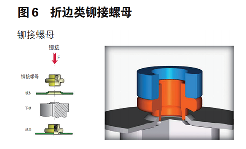 二、折邊類互鎖壓鉚標準件主要是通過標 準件底部的翻邊結構與開孔板材面在壓頭作用下,固有模具下擠壓翻邊折彎成型互相嵌套,形成互鎖結構,完成標準件與板材的連接。其結構形式如下圖 6 和圖 7 所示。