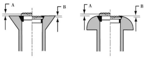 抽芯鉚釘安裝完成后,鎖圈必須與釘頭頂面保持齊平或者在頂面之下,允許鎖圈毛刺高度最大 0.005″. 釘頭齊平度從釘頭頂面到斷頸槽平滑面測(cè)量所得,具體要求如表 1 所列及圖 4 所示。