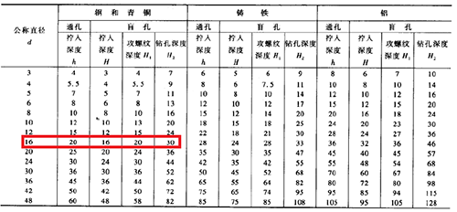設(shè)計(jì)手冊(cè)上提到的經(jīng)驗(yàn)公式,其主要考慮的是材料的性能,即不同材料的螺紋損壞的難易程度不同,其備用的扣數(shù)不同。以M16螺釘為例,鋼板通孔深度20,盲孔16。