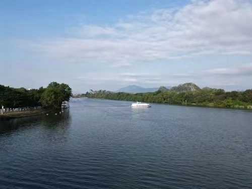 漓江猶如一條蜿蜒流淌的青綢綠帶,盤繞在萬千峰巒之間,匆匆流過。如詩如畫般的漓江,奇峰夾岸,碧水縈回,沿江田園錯落有致,景色十分秀美。船行江中,宛如迎面打開一幅幅奇妙山水畫卷,可觀奇峰倒影、漁翁閑釣,這一刻,我們真正體會到“船在江中走,人在畫中游”的絕美漓江仙境。