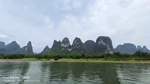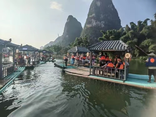 來桂林之前,我們就已聽聞“遇龍河”大名。遇龍河是陽朔一道亮麗的風景線。在這里,你可以選擇坐上竹筏,沿著河道漂流。船夫將全程撐竹筏,河水平緩,清澈見底。微風拂過水面,泛起陣陣漣漪,如同小提琴奏出的音符,靜靜的,輕輕的。