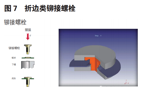 二、折邊類互鎖壓鉚標準件主要是通過標 準件底部的翻邊結構與開孔板材面在壓頭作用下,固有模具下擠壓翻邊折彎成型互相嵌套,形成互鎖結構,完成標準件與板材的連接。其結構形式如下圖 6 和圖 7 所示。