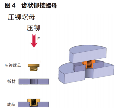 鉚接又稱壓鉚,又叫自扣緊,是一種與板材通過法向結構或者徑向結構互鎖的標準件連接形式。主要有齒狀互鎖壓鉚和折邊互鎖壓鉚兩種。可廣泛應用于鋁合金車身的沖壓件,擠出件和鑄造件各類零部件上。以下內容分別介 紹上述兩種常見類型的鉚接標準件。