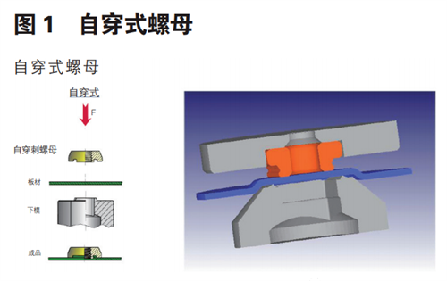 自穿式螺栓或螺母又稱自沖鉚螺栓或螺母,其中自穿式標準件是通過端部翻邊結構穿透板材并與之形成可靠互鎖結構的冷成型工藝。其 結構形式如圖 1、圖 2 所示。