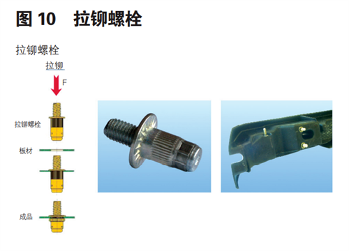 拉鉚是通過標準件頭部拉壓變形膨脹,與端部法蘭面上下夾住板材開孔,形成一種穩定可靠的標準件連接形式。用于各類金屬板材、管材等制造工業的緊固領域;在鋁車身上應用廣泛。其結構形式如下圖 9、圖 10 所示。