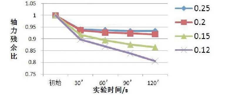 整個實驗過程中所用到的實驗樣件均由同一個生產廠家提供,保證材料、加工工藝等方面的一致性:實驗環境始終保持在常溫(出現個別天氣變化的情況要更改實驗進度計劃);實驗儀器中選擇的頻率為12.5 Hz,空載振幅為±0.8 mm;實驗終止條件為振動時間達到120s或者殘余軸向力減少至零。本實驗利用橫向振動試驗機,該試驗機可以測量出螺栓擰緊過程中的夾緊力、螺紋副上的扭矩以及分階段測出軸向力的變化,并對軸向力衰減做出一個實時反映。實驗采用的方法是單一變量的原理,整個實驗過程中唯一的變量是螺栓的摩擦系數(由表面處理不同來體現)。實驗共分為4組,每組各做10次實驗,每次實驗都要更換新的樣件及工裝夾具。每組實驗保證在初始軸向力相同的情況下(19.5 kN),分別記錄30s、60s、90s、120s的軸力變化,最終獲得各組螺栓的軸力殘余比。根據記錄數據的分析和對比可以判定緊固件的防松性能。在實驗過程中,夾緊力衰減的越慢(殘余比越大),防松性能越好;反之,夾緊力衰減越快(殘余比越?。?,防松性能越差。1)對實驗數據進行整理,得到不同摩擦系數的螺栓在振動過程中各監測點的殘余軸向力均值,如表2。通過表2可以得出,隨著實驗時間的推移,各組螺栓的殘余軸向力都有不同程度的衰減,且當摩擦系數由0.25降至0.12時,對應的軸力殘余比也依次降低,根據前面的分析可得,其對應的螺栓防松性能也依次下降。2)為了能更加直觀地表現出螺栓所受軸向力衰減與摩擦系數的關系,對實驗數據進行整合處理,得到各監測點殘余軸向力與初始軸向力百分比的平均值,如表3;并將不同摩擦系數下的各監測點軸力殘余比擬合成了四條曲線,如圖2。通過表3對四種摩擦系數下得到的螺栓實驗數據的對比,以及圖2表示的不同摩擦系數下各監測點軸力比的變化趨勢,可以得出以下測試結果。對于高強度螺栓(強度等級≥8.8)緊固過程中,在保證擰緊的前提下(初始軸向力一般為屈服軸向力的75%左右),以上四種摩擦系數的螺栓最終的軸力殘余比均≥80%,可見以上四組螺栓均具有一定的防松能力,但防松的性能有一定的差異;以上4種摩擦系數的螺栓在經歷120s的橫向振動后,軸向力都有衰減的趨勢,但4組螺栓的軸力衰減程度不同。摩擦系數高(0.25)的螺栓,在到達30s過后,衰減曲線幾乎趨于水平,軸力衰減相對較平緩,防松性能較好;摩擦系數低(0.12)的螺栓,經歷120s的實驗過程中,衰減曲線始終呈現坡度下降的趨勢,軸力衰減相對較快,防松性能相對較低。通過理論分析,得出摩擦系數是影響螺栓防松性能的一個關鍵性因素。摩擦系數較高時,螺栓的防松性能相對較好,即在防松方面的連接可靠性較高;反之,摩擦系數較低時,螺栓防松性能相對較差,即在防松方面的連接可靠性相對較低。當然,影響螺栓防松性能的因素不單是摩擦系數,同樣摩擦系數也不單只對螺栓防松性能起作用,它對螺栓擰緊過程中的扭矩系數、扭矩的轉換等也有直接關系。總之,摩擦系數的選取是一個平衡防松性能與強度效能利用的矛盾問題,本文只針對摩擦系數對螺栓防松性能的影響做了詳細的研究分析,具體螺栓摩擦系數的最終選取需要在此基礎上,根據螺栓的型號、使用場合等因素綜合考慮。