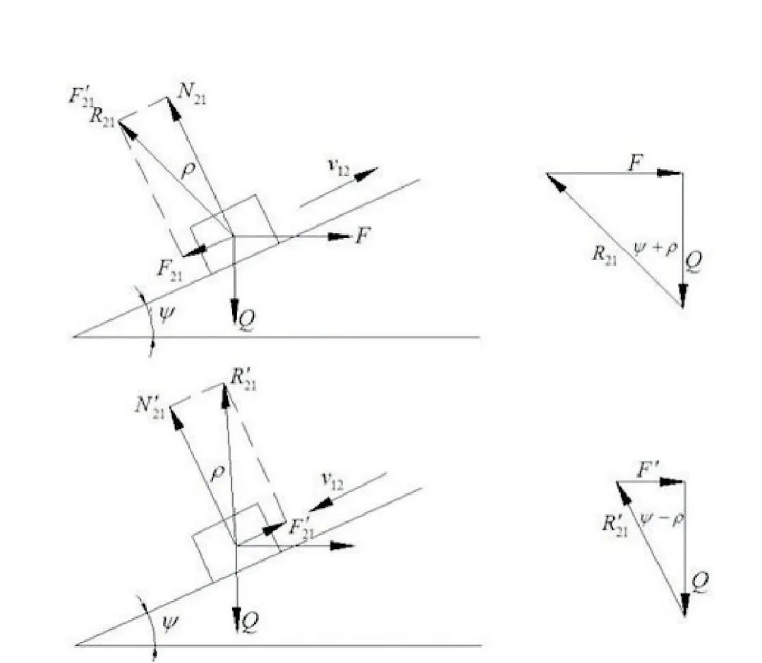 相互配合的螺紋之間受到的是一種復合力的作用,為了分析方便,以矩形螺紋作為研究對象。螺紋副中,螺母所受到的軸向載荷Q沿螺紋各圈平均分布,為便于分析,用集中載荷Q代替,并設Q作用在中徑為d2圓周上的一點。將矩形螺紋沿中徑d2展開,得到斜角等于螺紋升角的斜面。當螺母相對于螺桿等速旋轉時,可看作一個滑塊(螺母)沿著斜面作等速滑動,如圖1。擰緊螺母時,相當于水平推力F推動滑塊沿斜面向上滑動,它的作用方向與d2的圓周相切,運動過程中還受到接觸面的摩擦力Ff、軸向載荷Q。