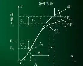 圖中F1是TA法最大螺栓軸向預緊力誤差,F2是SPA法最大螺栓軸向預緊力誤差。從圖中可見,采用TA法時,由于預扭矩TS的誤差(ΔTs=Ts2-Ts1,對應產生了螺栓軸向預緊力誤差ΔFs),在轉過相同的轉角A1后,相對于兩個彈性系數高低不同的擰緊工況,其螺栓軸向預緊力誤差為F1;即使是彈性系數相等的,但由于ΔTs 的存在,也有一定的誤差(見圖中的ΔF1、ΔF2)。
