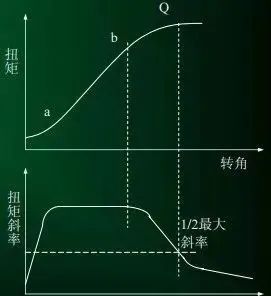螺栓在擰緊的過程中,其扭矩/轉角的變化曲線見扭矩、扭矩斜率對比圖。真正的擰緊開始時,斜率上升很快,之后經過簡短的變緩后而保持恒定( a_b區間)。過b點后,其斜率經簡短的緩慢下降后,又快速下降。當斜率下降一定值時(一般定義,當其斜率下降到最大值的二分之一時),說明已達到屈服點(即扭矩對比圖中的Q點),立即發出停止擰緊信號。屈服點控制法的擰緊精度是非常高的,其預緊力的誤差可以控制在±4%以內,但其精度主要是取決于螺栓本身的屈服強度。
