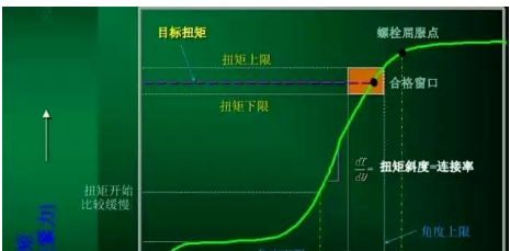 通過上面夾緊力圖即可看出,同樣的轉角誤差在其朔性區的螺栓軸向預緊力誤差ΔF2比彈性區的螺栓軸向預緊力誤差ΔF1要小得多。屈服點控制法就是把螺栓擰緊至屈服點后,停止擰緊的一種方法。它是利用材料屈服的現象而發展起來的一種高精度的擰緊方法。這種控制方法,是通過對擰緊的扭矩/轉角曲線斜率的連續計算和判斷來確定屈服點的。