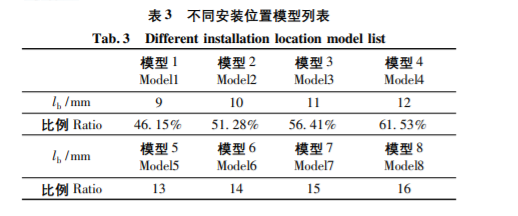 fpry的影響分析公式(4) 中可以得出對杠桿力最直接的影響因素除了上述的預緊力還有外載荷作用線與螺栓軸線之間距離lb,該距離越短,相同條件下螺栓結構能承受的杠桿力就越大。在預緊力給定的條件下本節中調整上述模型中的lb長度,確定其在總長中的比例, 建立8個模型,在相同杠桿力作用下對該參數進行討論分析。