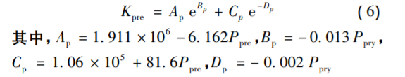 綜合上述分析可以看出,聯接剛度隨著杠桿力的作用發生了很大的變化,聯接剛度是結構進行動力學分析的最重要條件,因此合理的預測和分析該參數對于動力計算有至關重要的影響。對預緊力和杠桿力作用距離lb對結構剛度的影響進行了分析,隨著杠桿力的增加,聯接結構剛度顯著下降。分析其下降趨勢符合雙指數形式的類型,考慮選取參數進行擬合,擬合公 式( 5) ,分別選取預緊力及杠桿力影響因子為自變量參數,根據表2 和表4的數據對其余參數進行擬合[10]。