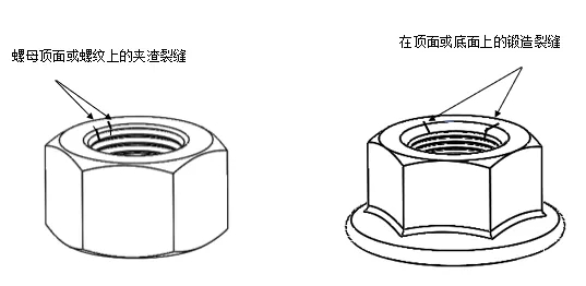 鍛造裂縫和夾渣裂縫的原因:鍛造裂縫可能在切料或鍛造工序中產生,并位于螺母的頂面或底面上,或頂面(底面)與對邊平面交接處。夾渣裂縫由原材料固有的非金屬夾渣而造成。