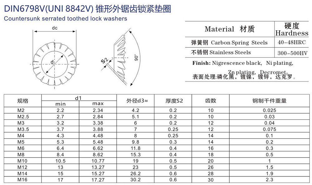 錐形外鋸齒鎖緊墊圈 V型 DIN6798V,常用規格M2-M16備有現貨,還可根據客戶需求定制,選優質SUS304.SUS316不銹鋼材質。